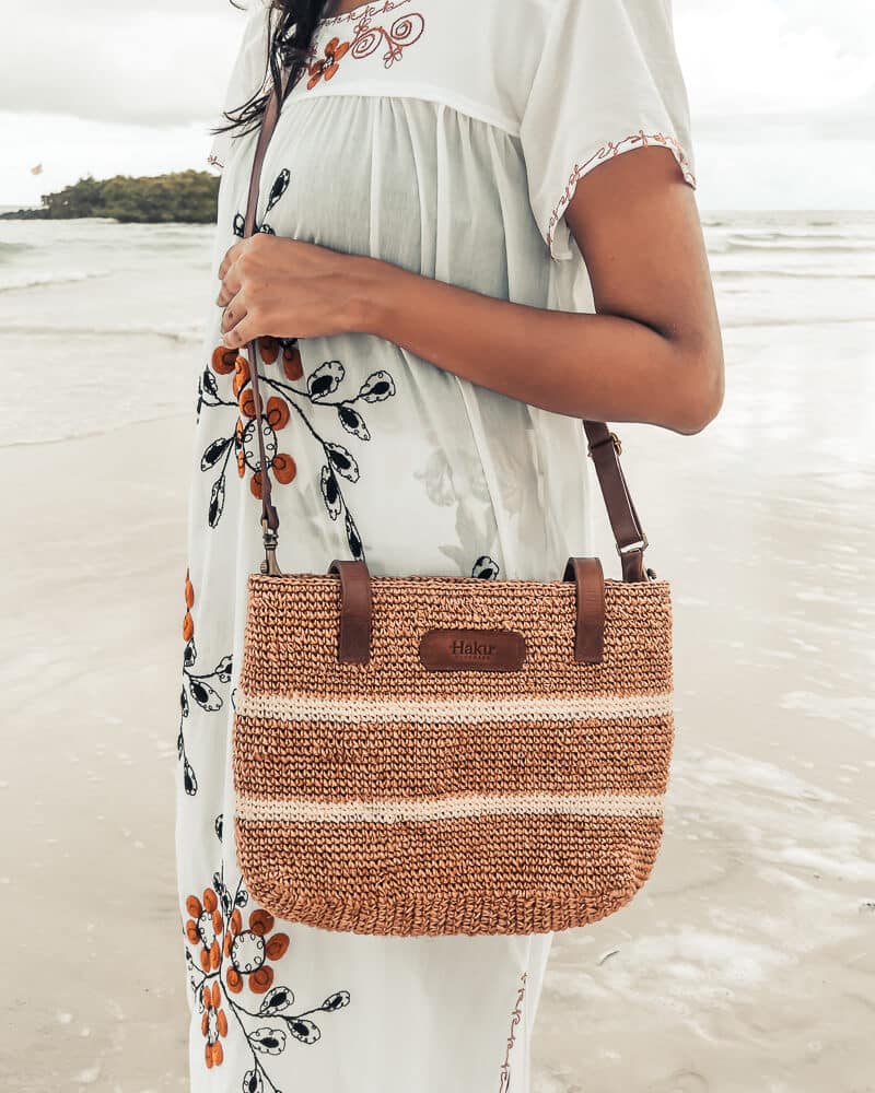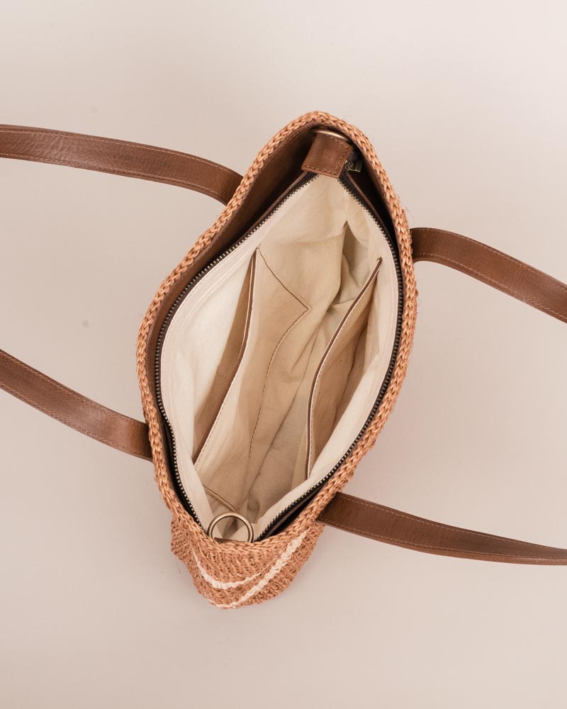 A unique design with noble materials and artisanal technique: that’s our Mar bag. This bag has a boho chic vibe, combining cabuya with vegetable tanned leather, and is perfect for everyday use. It’s lined with 100% cotton linen and has two small pockets to enhance your organization. It has a closure and also a removable leather strap that you can attach if you want to wear the wallet on the shoulder or crossbody. We have it available in three colors, all of which are very versatile.